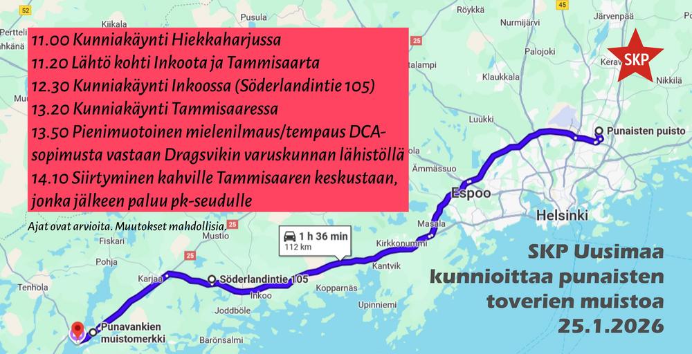 SKP kunnioittaa luokkasodassa 1918 teloitettuja punaisia tovereita Teemme kunniakäyntejä muistomerkeillä usealla paikkakunnalla. Koska luokkasodan alkamisen muistopäivä osuu arkipäivälle, toteutamme käyntejä lauantaina 24.1. ja sunnuntaina 25.1. Kuvassa näkyy sunnuntain matkasuunnitelma Vantaan Hiekkaharjusta Inkoon kautta Tammisaareen.