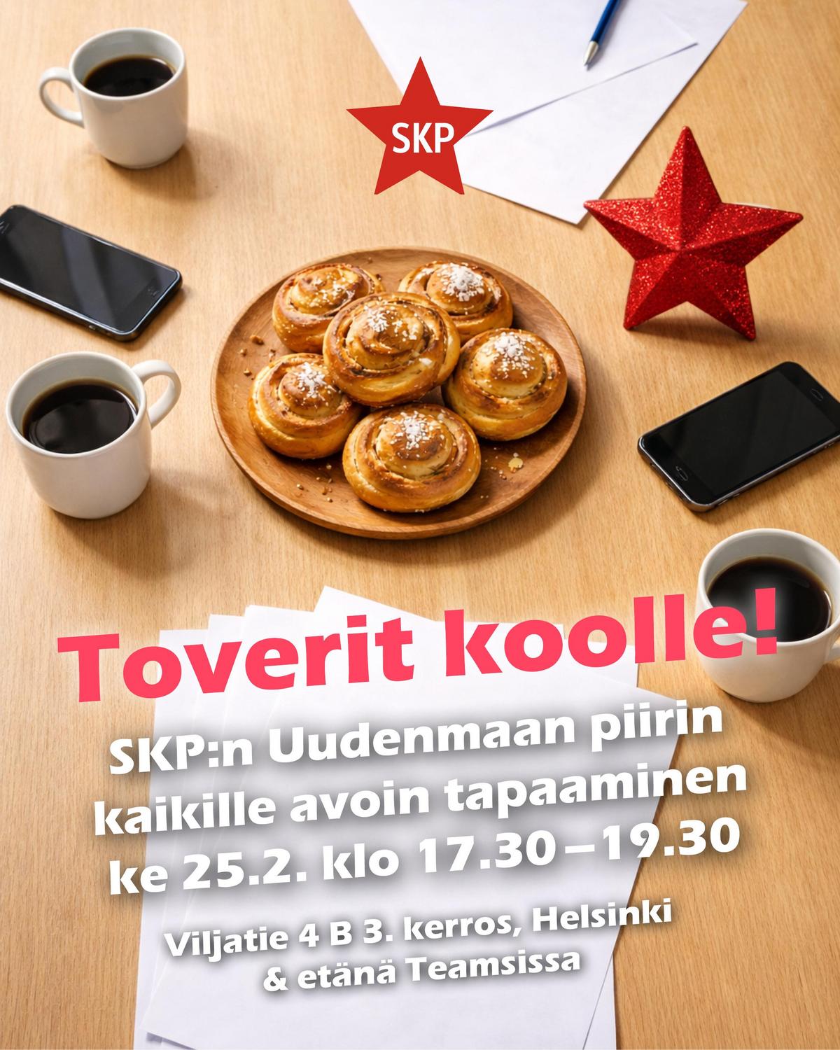 Kaikille kiinnostuneille avoin, matalan kynnyksen uusmaalainen Toverit koolle! -tapaaminen pidetään Malmin toimistolla (Viljatie 4 B 3. kerros, Helsinki) keskiviikkona 25.2. klo 17.30–19.30!